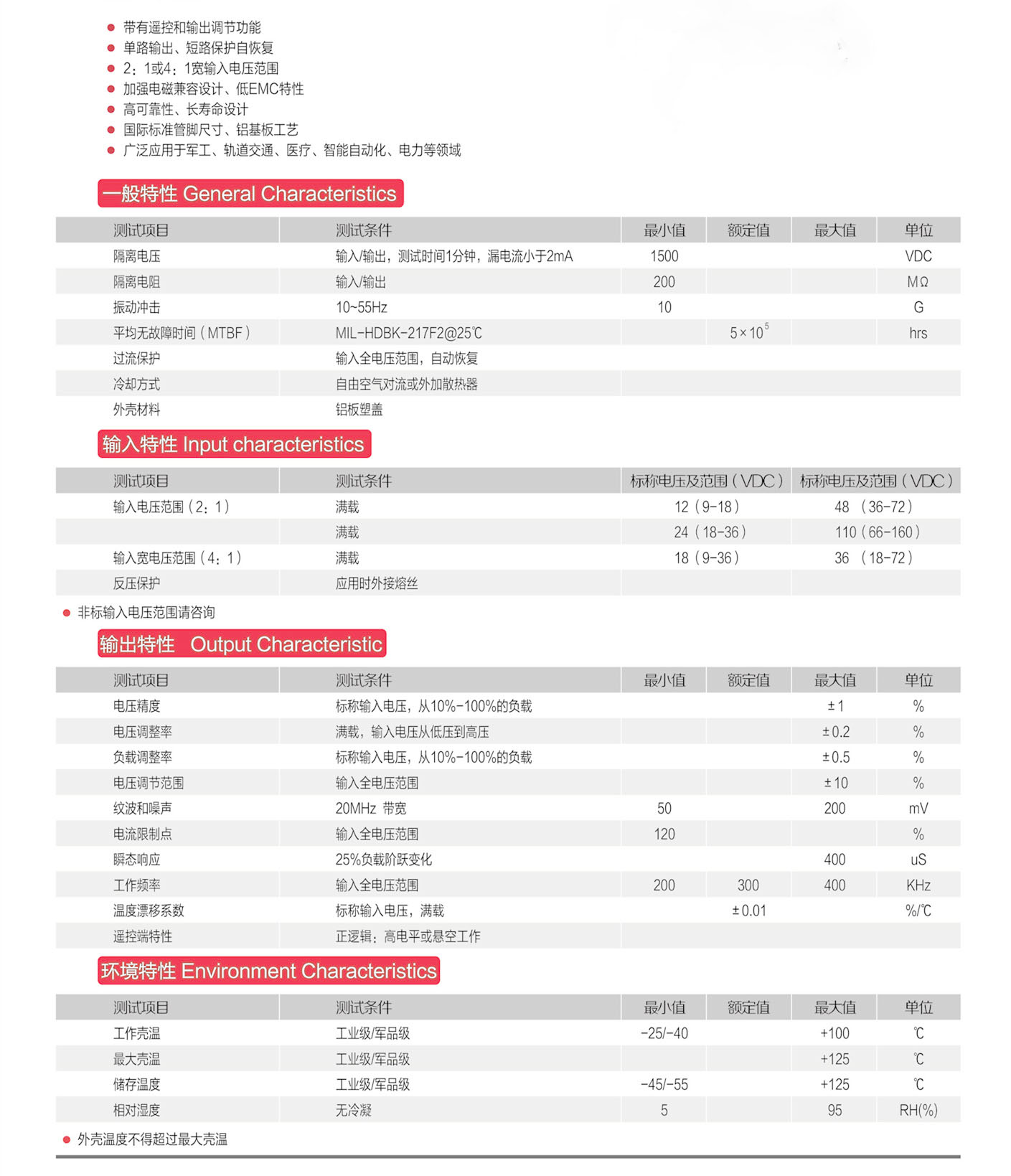 典型性能:寬壓輸入(1:2或1:4)、單路、雙路輸出,輸出低紋波噪聲、高穩壓精度、長期短路保護自恢復、使用效率高,高隔離耐壓