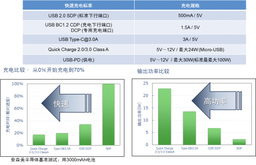 為加快充電速度,縮短充電時(shí)間,市場上產(chǎn)生了各種快速充電標(biāo)準(zhǔn),其規(guī)格和充電速度及輸出功率如圖4所示。一般而言,輸出電流和輸出電壓越高,充電越快。安森美半導(dǎo)體的移動(dòng)電源方案LC709501可自動(dòng)檢測移動(dòng)設(shè)備的電池標(biāo)準(zhǔn),并集成最佳充電方式選擇功能,通過更新固件支持最新的快速充電標(biāo)準(zhǔn),如高通快速充電QC2.0和QC3.0等專有充電協(xié)議,并可通過額外的軟件支持USB PD和Type-C連接,資深用戶甚至可對LC709501F重新編程以實(shí)現(xiàn)定制的充/放電協(xié)議,通過改變外部MOSFET支持最大12V、2.5A(30W)的輸出功率等級。