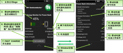 如圖2所示,只要基于LC709501的移動(dòng)電源被連接到移動(dòng)設(shè)備如智能手機(jī),創(chuàng)新的移動(dòng)電源應(yīng)用程序就自動(dòng)啟動(dòng),移動(dòng)電源的詳細(xì)運(yùn)行信息及關(guān)鍵參數(shù)將顯示在智能手機(jī)的屏幕,如移動(dòng)電源電池剩余電量及動(dòng)畫運(yùn)行、移動(dòng)電源電池使用時(shí)間、剩下的充電時(shí)間、電池溫度、快充開關(guān)按鈕等等,并且該方案還支持移動(dòng)電源供應(yīng)商在該App界面顯示其公司Logo。