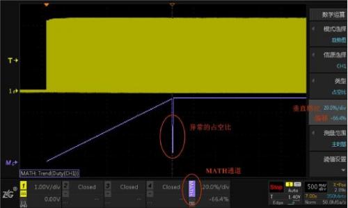 這個時候用ZDS4000系列示波器新開發(fā)獨特的占空比趨勢測量功能,將每一個PWM波的占空比顯示在屏幕上,點擊示波器數(shù)學(xué)運算Math按鍵,模式選擇趨勢圖,類型選擇占空比,示波器會自動檢測PWM波的周期和閾值,無需過多設(shè)置,就可以快速出波形,波形如圖5所示。屏幕上除了通道1,還多了MATH通道,顏色為紫色,MATH通道顯示的即是占空比趨勢,可以看到占空比緩慢遞增后大約在屏幕中間位置出現(xiàn)了異常。和通道1一樣,MATH通道也可以調(diào)節(jié)垂直檔位和偏移。