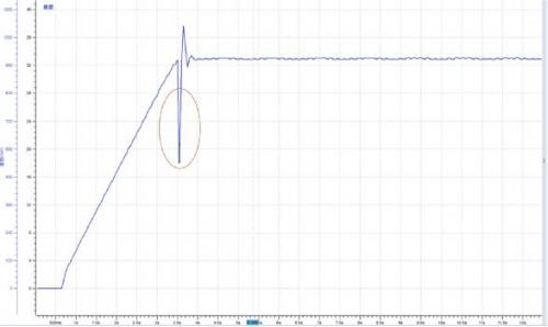 某使用PWM波形驅(qū)動的直流電機在加速過程中存在微小抖動情況,觀察電機轉(zhuǎn)速波形如圖3所示,開始加速后大約在3.6秒轉(zhuǎn)速出現(xiàn)一個下拉動作。電機PWM調(diào)速原理是通過改變接通脈沖的寬度,使直流電機電樞上電壓的占空比改變,從而改變電樞電壓的平均值,控制電機的轉(zhuǎn)速。因此基本可以確定這個轉(zhuǎn)速下拉動作是由于PWM波占空比出現(xiàn)異常引起的。