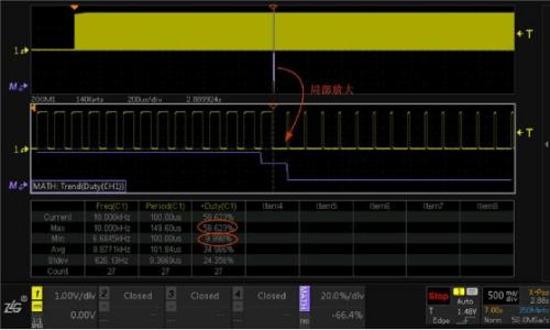 定位到占空比異常位置后,開啟示波器縮放模式下ZOOM多窗口顯示功能,對信號進行局部放大,如圖6所示,可以清晰的看到占空比異常的細節(jié),同時開啟對ZOOM1窗口數(shù)據(jù)的測量和統(tǒng)計,可以看到占空比從正常的59.62%變?yōu)?.99%左右。