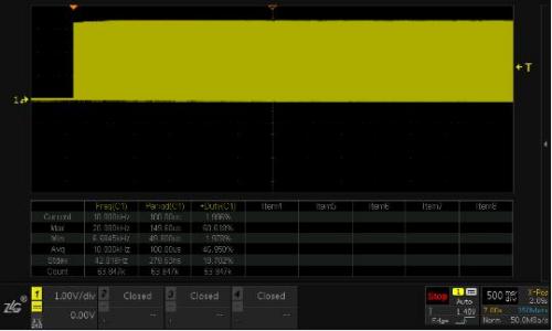 示波器的存儲深度對占空比趨勢測量影響很大,所謂趨勢趨勢,即是長時間的變化動向,如果存儲深度小,那么所記錄的時間就很短,采樣的波形也就很少,對于分析趨勢就沒有意義。目前ZDS4000系列示波器存儲深度高達512Mpts,可以在高采樣率下存儲數(shù)十秒的波形,比較適合分析信號變化趨勢。