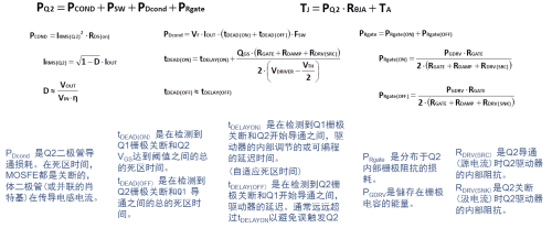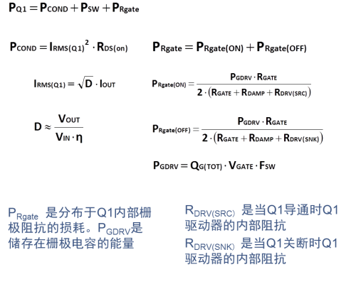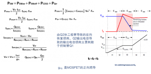 對于高頻應用(>MHz),控制管Q1的選用應針對降低開關損耗進行優化。Q1損耗的計算公式如下: