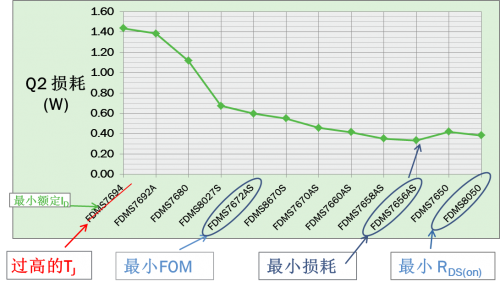 對于Q2,VIN= VINMAX時損耗最大。圖3所示的12個器件中,FDMS7656AS有最低的最大損耗。但由于Q2 寄生參數會影響Q1的 開關損耗, 最小Q2 損耗通常并不意味著最佳的總能效。必須比較Q1及Q2的總功耗來找到最佳的Q2以實現最高能效。