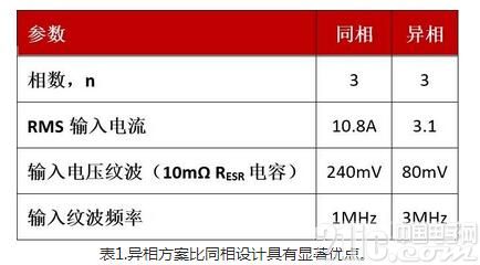 表1總結了三個同相工作轉換器和三個異相工作轉換器的性能結果對比。