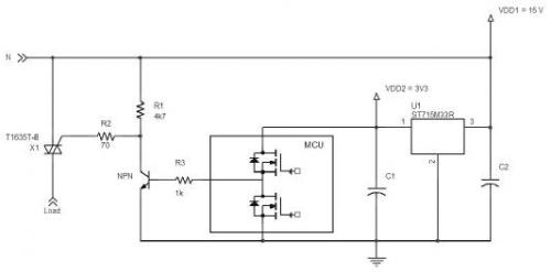 基于這些原因,圖2的電路示意圖整合了負電源和正穩壓器的雙重優點。在這個示意圖中,ST715M33R是最大靜態電流5.5 µA的正穩壓器,與“負”15V輸出相連,為微控制器提供3.3V電源電壓,其中,-15V電壓是基于VIPer06的降壓升壓轉換器或反激式轉換器的輸出 (參見意法半導體的AN4564應用筆記)。T1635T-8是一個T系列三象限雙向可控硅,微控制器能夠吸收T1635T-8的電流。
