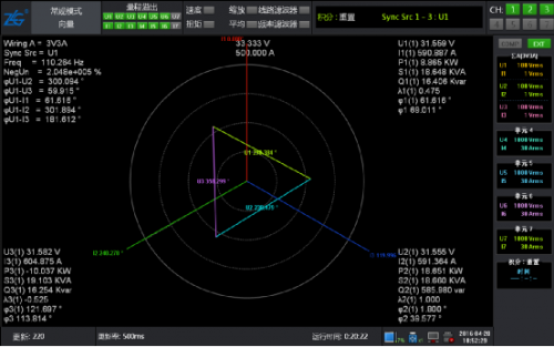 此時將系統運行起來,通過功率分析儀的數據和波形再次進行驗證,電壓波形圖和矢量圖都很完美。