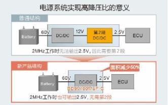 然而,車載系統(tǒng)必須保持2MHz工作,而能夠從48V直接降壓到驅(qū)動ECU(Electronic Control Unit)所需的3.3V或5V的電源IC并不存在,需要制造12V等中間電壓,進(jìn)行2步降壓。