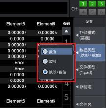 第三,數據類型里有“數值”、“波形”、“數值+波形”三個選項,代表存儲的數據類型,點擊“數值”則表示只記錄數值數據,點擊“波形”則表示只記錄波形數據,點擊“數值+波形”則同時記錄數值和波形數據;