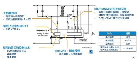 開關電源分為隔離與非隔離兩種形式,對于中小功率的應用,常用的隔離電源拓撲結構有正激式和反激式。反激式指在變壓器原邊功率開關管導通時副邊整流管截止,變壓器儲能。原邊開關管截止時,副邊整流管開始導通,能量釋放到負載,周而復始的開關工作。反激式電源結構簡單,省掉了一個和變壓器體積大小差不多的電感,因此在中小功率電源中得到廣泛的應用。從控制方式來看,InnoSwitch3系列產品初次級之間采用數字反饋的FluxLink技術進行反饋信息的傳輸,對初次級的開關實現精確的時序控制,可以實現非常高的效率,同時其動態響應特性極佳,而且輸出紋波很小。其次級檢測輸出電壓電流的控制方式使得該系列產品可以輸出高達65W的輸出功率,如果采用前級的功率因素校正電路,甚至可以輸出100W的輸出功率。。