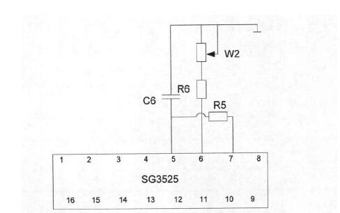 本文設計的模塊控制與驅動模塊,工作頻率是由芯片的腳、腳和腳外接的電阻與電容來確定。如圖所示,其中電阻和滑動變阻器組成,電容即為,為。根據計算公式可以知道