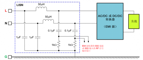 LISN 測量 EUT 產(chǎn)生的傳導(dǎo)發(fā)射。它是插入 EMI 源和電源之間測量點(diǎn)的接口,確保 EMI 測量結(jié)果的可重復(fù)性和可比較性。圖 3 所示為根據(jù) CISPR 16-1-2 [12] 或 ANSI C63.4標(biāo)準(zhǔn)定義的標(biāo)準(zhǔn) 50μH LISN 的功能等效電路(并非完整原理圖)。